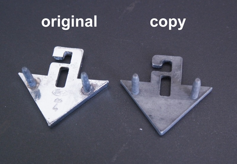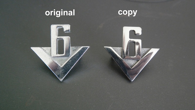 New V6 hood emblems, remake. Size and pins are as original. Made of stainless steel, and polished to get chrome look. Will never corrode!
